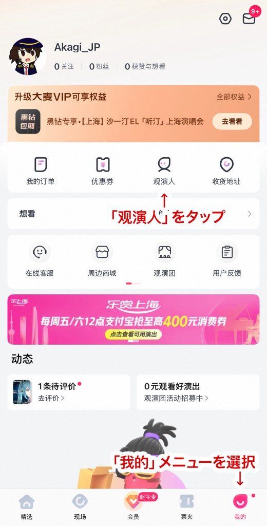 - 「我的」メニューから「观演人」をタップ