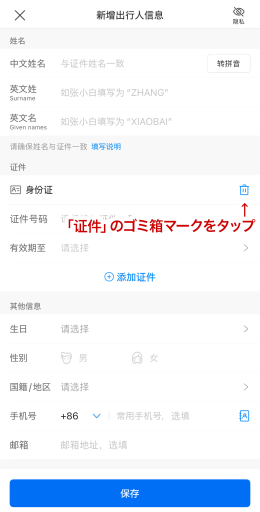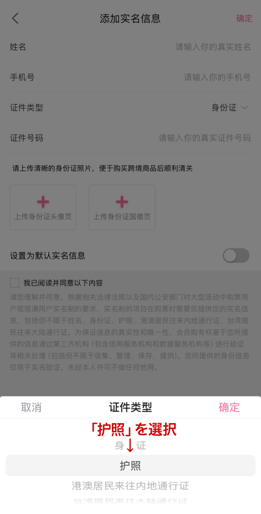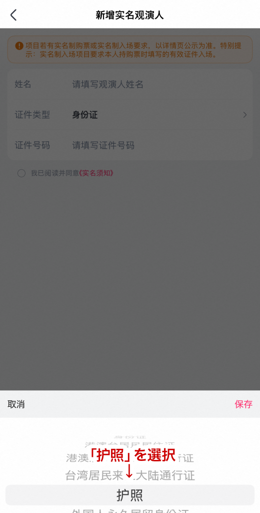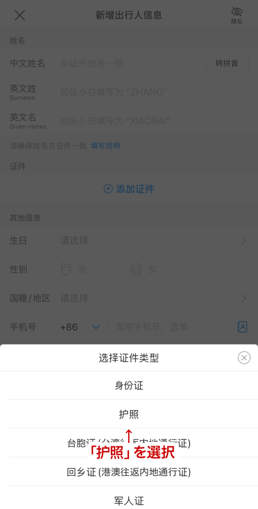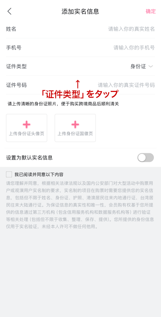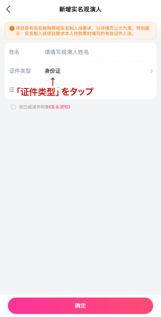 - 「证件类型」をタップ
