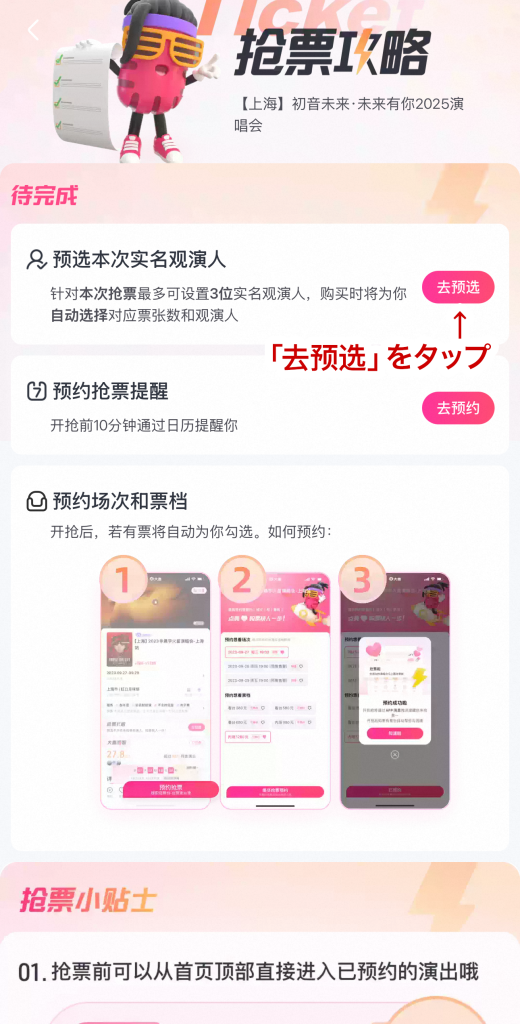 - 「预选本次实名观演人」から「去预选」をタップ