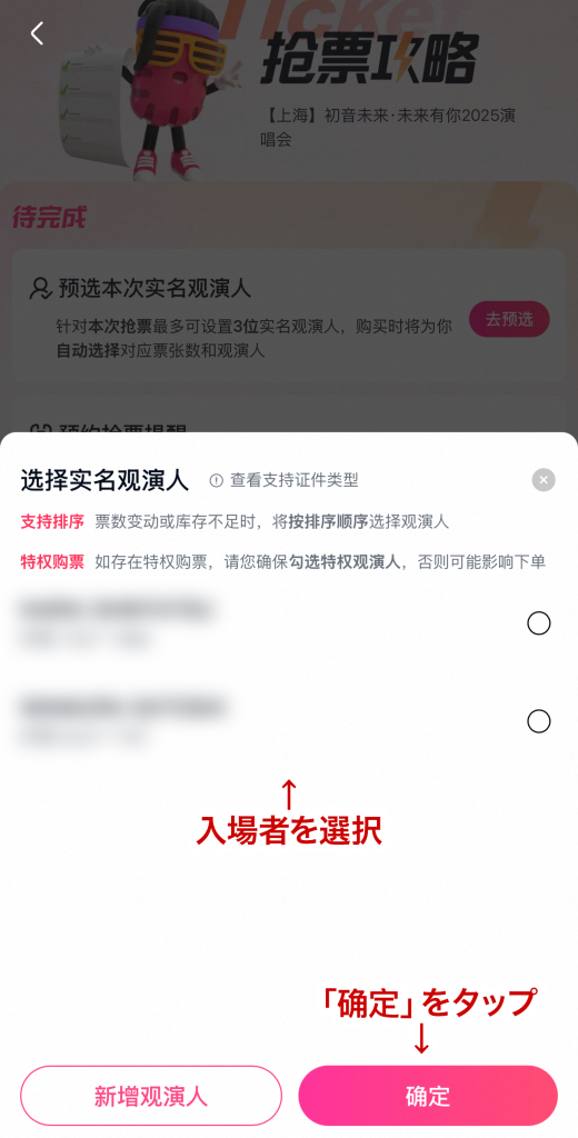 - 先ほど追加した入場者を選択して「确定」をタップ