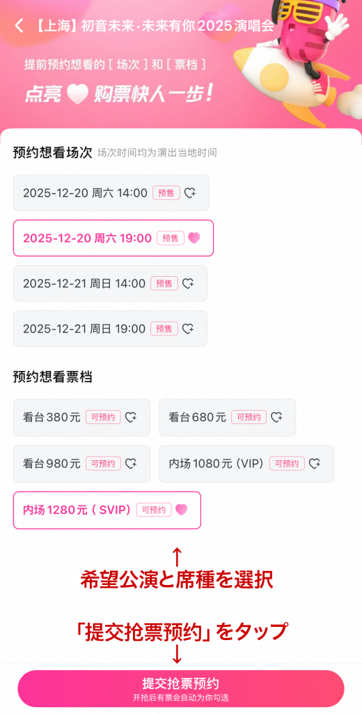 - 希望する公演と席種を選択し、「提交抢票预约」をタップ