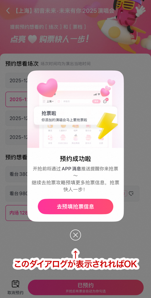 - 「预约成功啦」のダイアログが表示されれば完了
