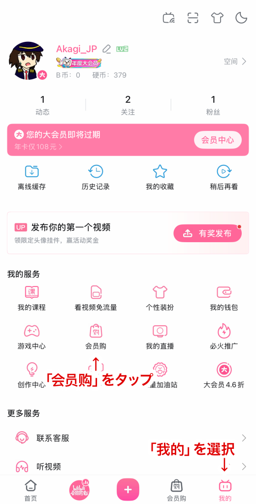 - bilibiliアプリの「我的」メニューから「会员购」をタップ