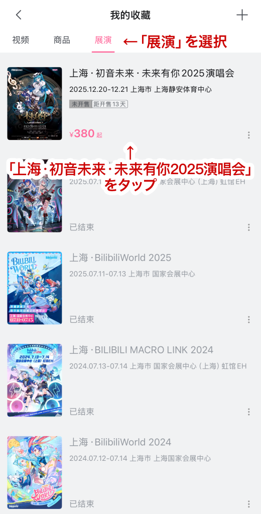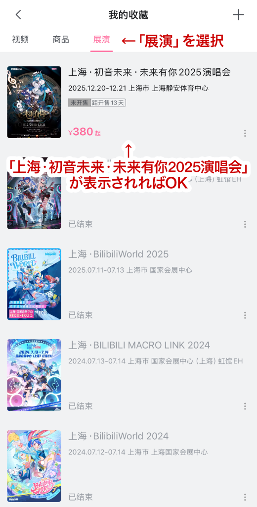 - 「展演」を選択し、「上海・初音未来・未来有你2025演唱会」が表示されれば完了