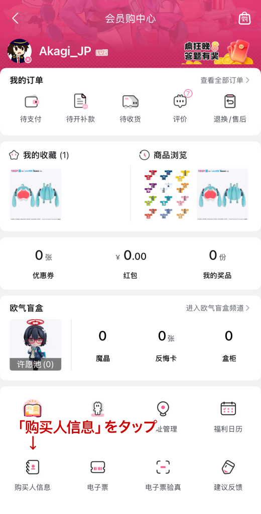 - 「我的」メニューから「会员购」をタップ