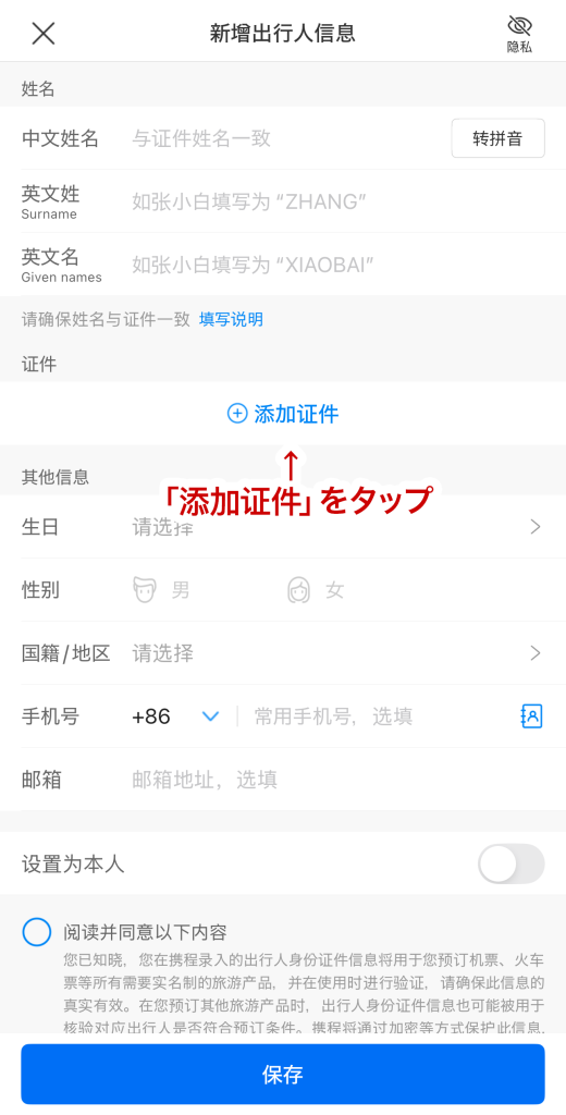 - 「添加证件」をタップ