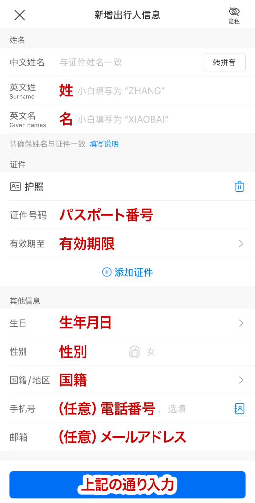 - 氏名、電話番号、パスポート番号を入力